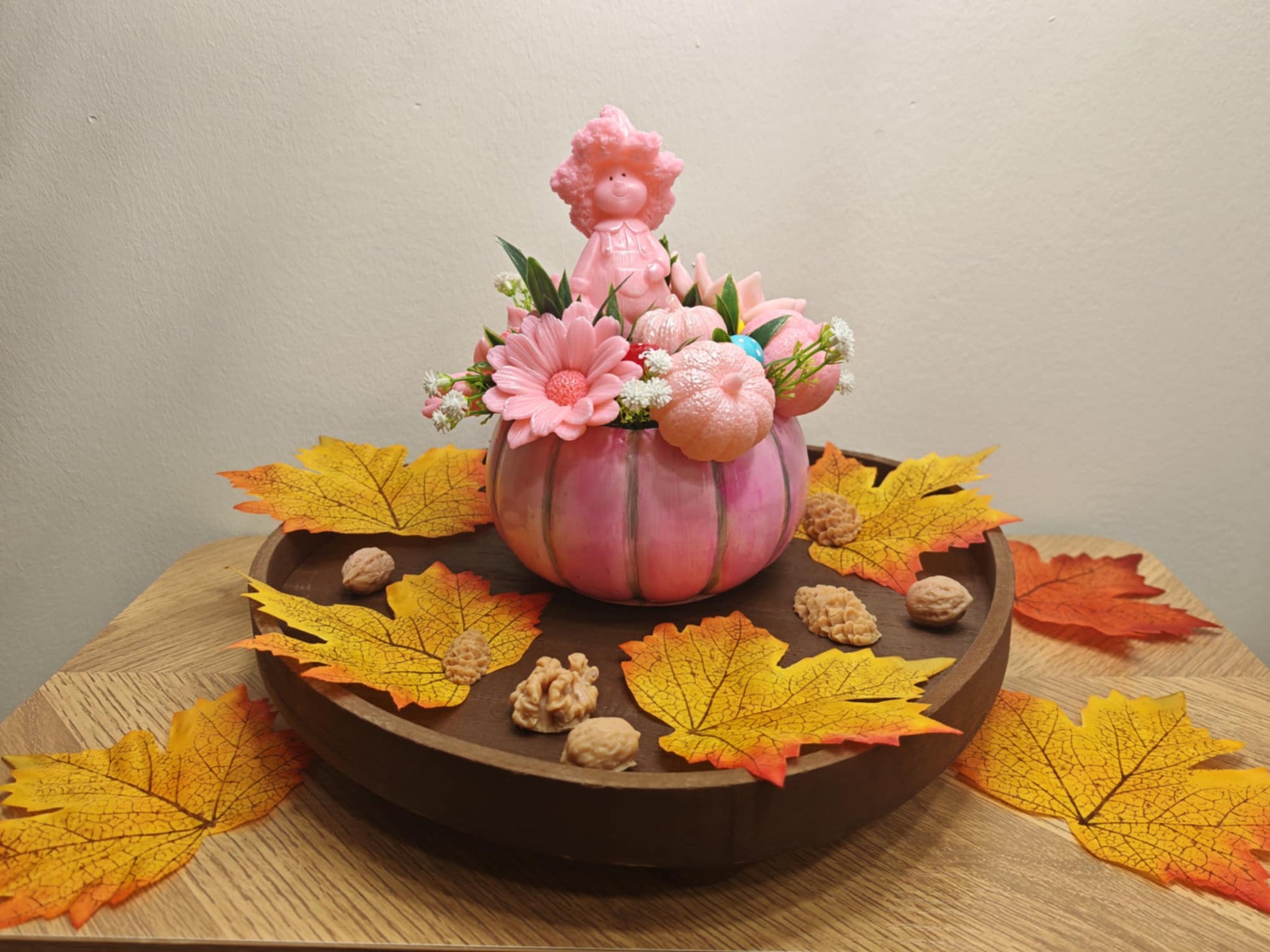 The soap flowers and pumpkins are carefully placed in a hand-cast pumpkin made of ceramic dust, creating a decorative piece that delights the eye and invites the senses.
